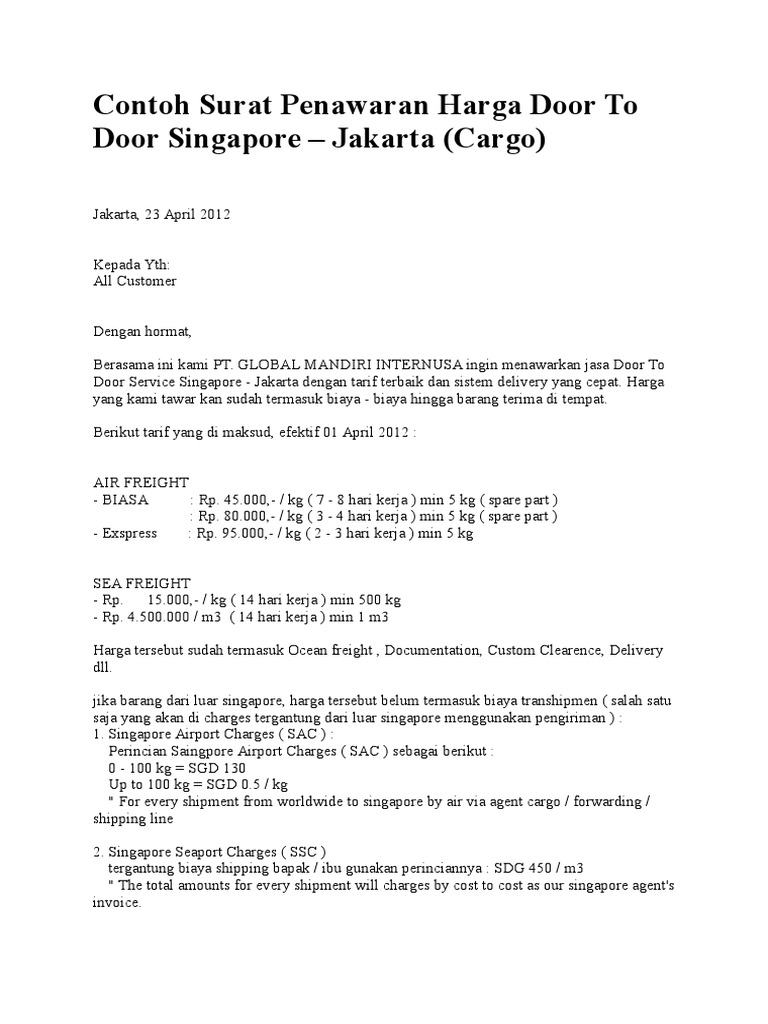 Surat pemawaran harga pengiriman barang cargo. Contoh surat penawaran jasa bengkel mobil archives gawe cv. 8 contoh surat penawaran harga barang jasa kerjasama dll lengkap. Demikian surat penawaran ini kami buat, atas kerjasamanya kami ucapkan banyak terima kasih. Cek status pengiriman cargo garuda.